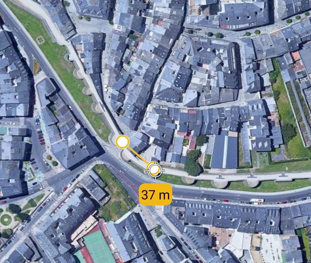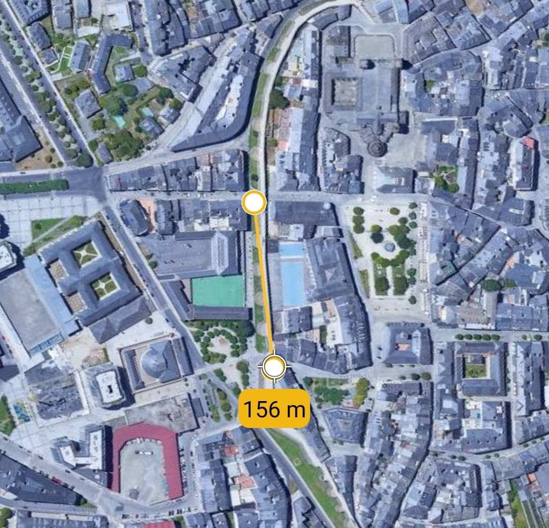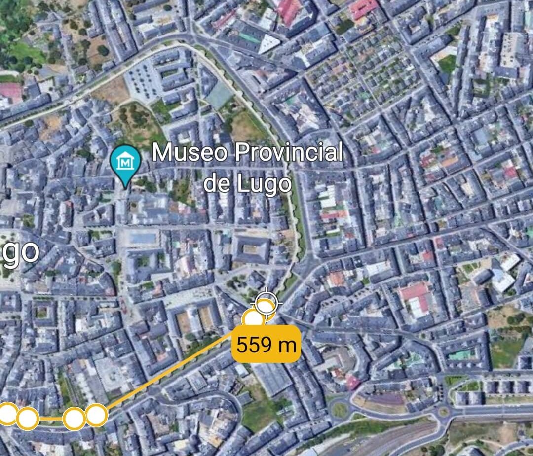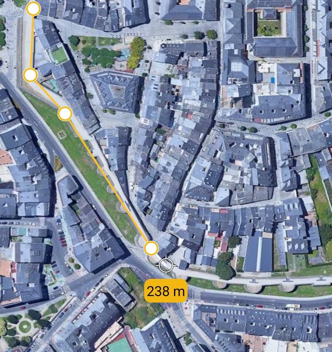 1. (OJO, suelo de piedra granítica sin relieve, algo desgastado por el perímetro de la catedral hasta la rampa de subida) La salida estará situada en el Concello de Lugo, desde el que bordearemos la Praza Maior por su zona este. Al llegar al fondo de la plaza, giraremos a la derecha y seguidamente a la izquierda, quedando a la vista la catedral de la ciudad. Seguiremos caminando con la catedral a nuestra izquierda y rodeando su perímetro hasta llegar a la rampa de subida a la muralla romana situada junto a la Porta de Santiago. Este será el lugar donde retiraremos los tacos.
